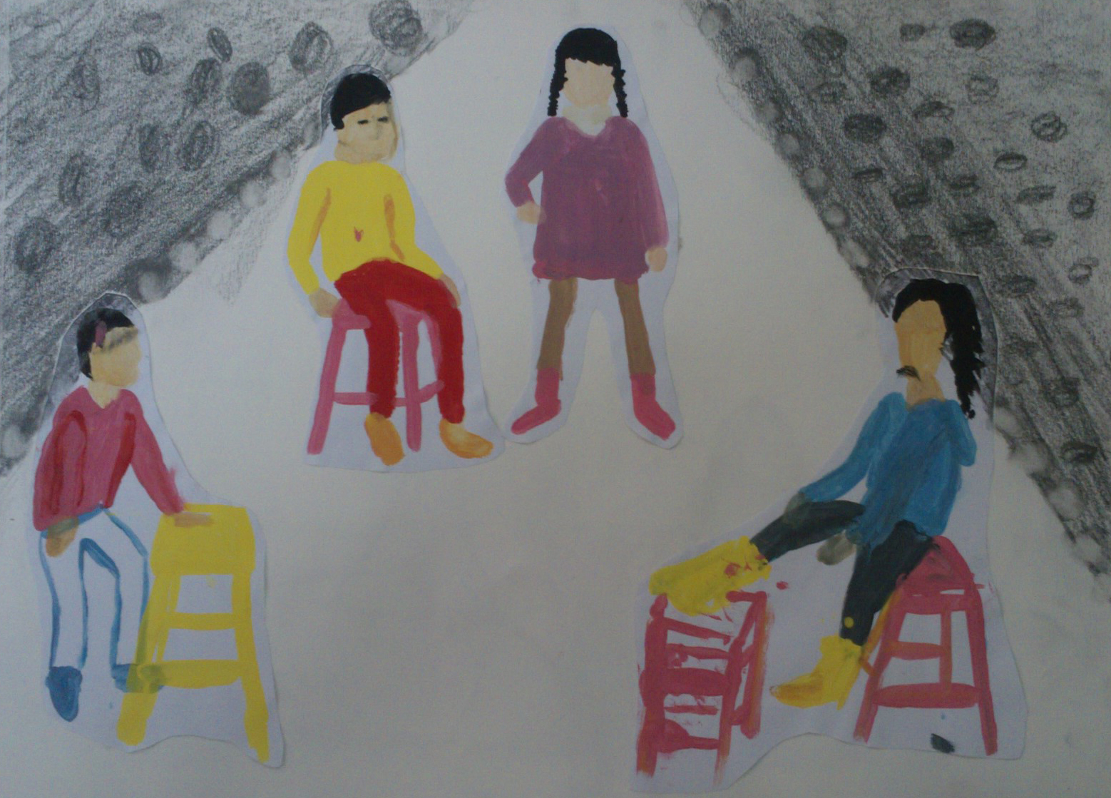 De nuevo abordamos el apunte, el dibujo rápido en el que tratamos de empezar a entender al anatomía del cuerpo humano, a base de ser nosotros mismos modelos improvisados para posar ante los compañeros. En esta ocasión damos un paso más y tras hacer unos cuantos apuntes que no duran más de diez minutos, el objetivo es elegir un mínimo de dos o tres y generar con ellos una composición mayor, una situación en que puedan entrar en relación esos cuerpos que hemos copiado y sus distintas posturas. Todo vale, desde construir un escenario, añadir expresión a los rostros, bocadillos...